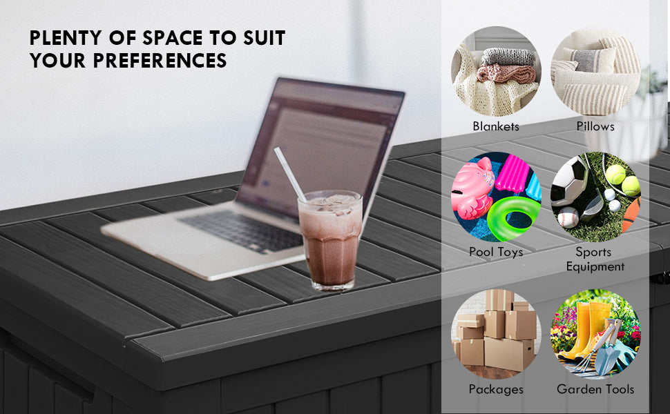 - Stylish and versatile: With its clean, modern design, our storage box is more than just practical - it’s stylish too. It complements any outdoor decor, making it a versatile choice for patios, decks, balconies, or even garages. It’s a functional and aesthetic addition to your space.